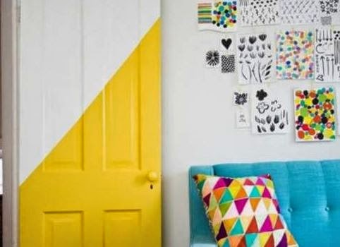 ντουλάπας σου για να σου φτιάχνει τη διάθεση κάθε φορά που θα το βλέπεις.Βάψε το εσωτερικό των ντουλαπιών της κουζίνας σου. Αυτό θα την κάνε πολύ πιο χαρούμενη.Φαίνονται οι σωλήνες κάτω από τον νεροχύτη του μπάνιου σου. Μπορείς να τους βάψεις με κάποιο έντονο χρώμα.Βάψε διαγώνια μία από τις πόρτες του σπιτιού σου με ένα έντονο χρώμα σαν το κίτρινο της φωτογραφίας.